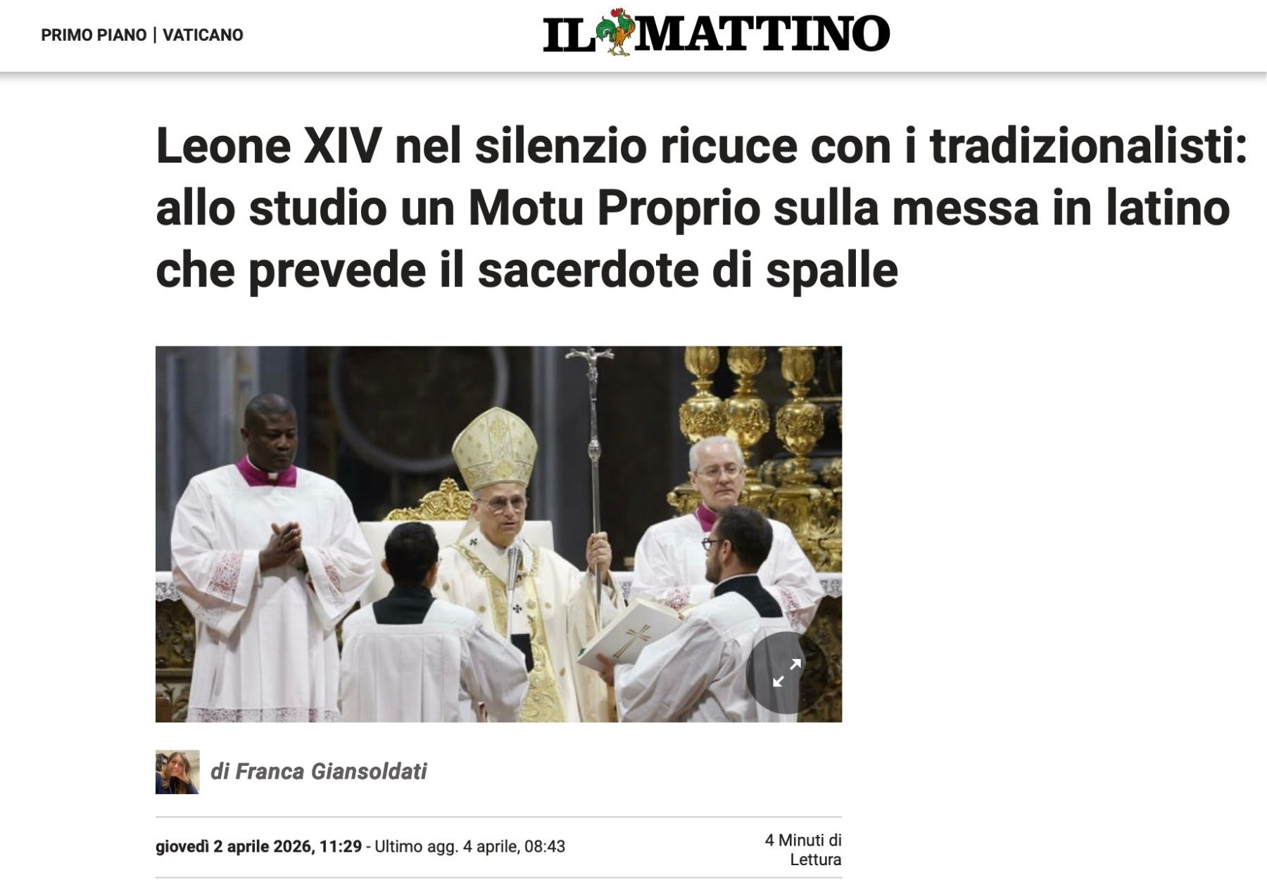 Unfortunately, fantasy was soon overtaken by reality. At 11.29 a.m. on 2 April, the “highly capable and utterly reliable” Vatican correspondent Franca Giansoldati published an article under the headline: “Leo XIV quietly mends ties with traditionalists.” We are speaking of the highly capable Vatican correspondent who for thirty years has rendered “honourable service” in reporting on the Vatican and the Catholic Church, and who is a “friend and colleague” of those boasters who have for years prowled like jackals around Vatican affairs. By completely distorting the meaning of the article, which Giansoldati evidently did not even understand, despite being a know-it-all and, of course, certainly knowing German as well, her piece claims that Leo XIV has for months been engaged in patient, discreet efforts to heal the rupture with the traditionalist world and has identified a compromise solution to defuse the dispute over the pre-conciliar liturgy.