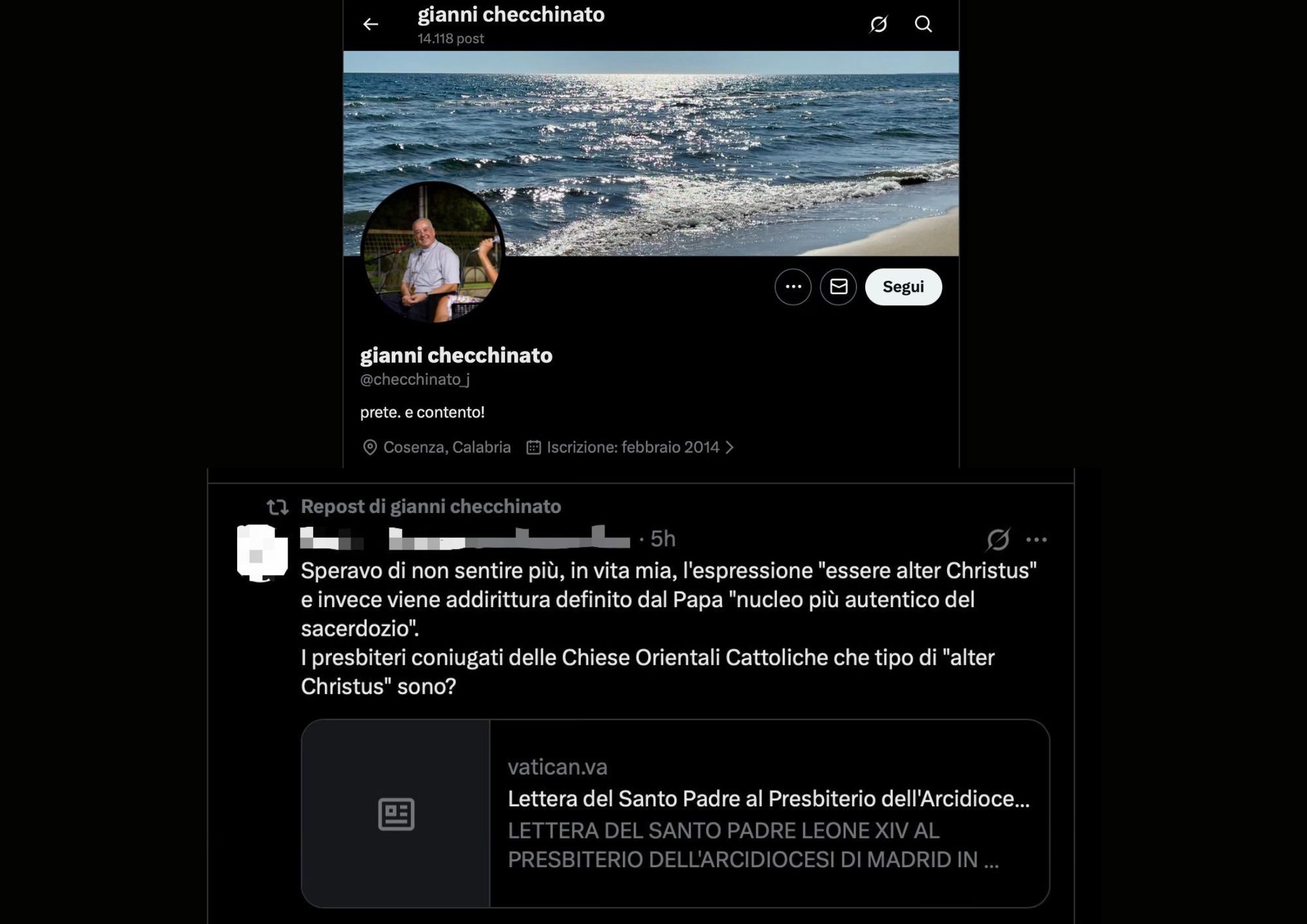 Il clero, non soltanto quello di Madrid, l’ha accolta con entusiasmo: in queste ore la lettera circola nei messaggi WhatsApp, viene inoltrata, commentata, persino stampata. Questa mattina è stata anche materia di confronto durante un ritiro del clero. Proprio per questo risulta sconcertante quanto è accaduto questa mattina su X (ex Twitter): l’Arcivescovo Giovanni Checchinato, metropolita di Cosenza-Bisignano, ha ritwittato un post di un autore sconosciuto e non cattolico che attaccava frontalmente il Papa per l’uso dell’espressione “alter Christus”, derisa come un residuo da cancellare: «Speravo di non sentire più, in vita mia, l’espressione “essere alter Christus” e invece viene addirittura definito dal Papa “nucleo più autentico del sacerdozio”». Ciò che possa sperare un non cattolico che, con singolare presunzione, pretende di giudicare e colpire le scelte del Successore di Pietro a noi non interessa. Colpisce invece - e non poco - che un Arcivescovo cattolico, che negli anni scorsi non ha mai osato mettere in discussione il Papa, oggi scelga di rilanciare un attacco tanto insignificante quanto frontale al Pontefice: un gesto estraneo al senso cattolico e, proprio per questo, anche pericoloso.
