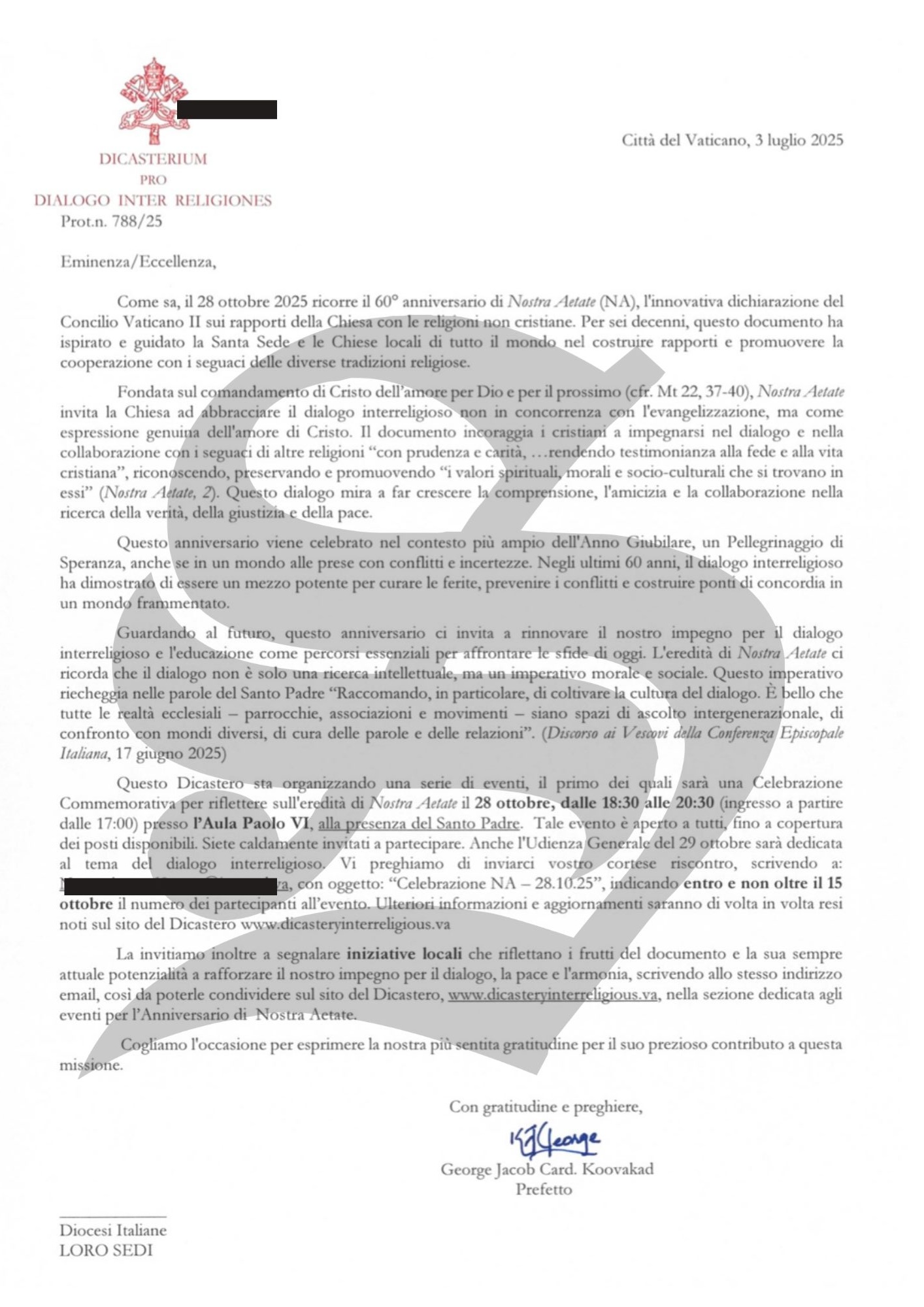 Città del Vaticano – In vista del 60° anniversario della Nostra Aetate, la Dichiarazione del Concilio Vaticano II sui rapporti della Chiesa con le religioni non cristiane, il Dicastero per il Dialogo Interreligioso ha inviato una lettera a tutte le diocesi italiane. Il documento, firmato dal prefetto, il cardinale George Jacob Koovakod, invita i vescovi a prepararsi a un importante momento commemorativo che si terrà il prossimo 28 ottobre 2025, alla presenza del Santo Padre, nell’Aula Paolo VI.